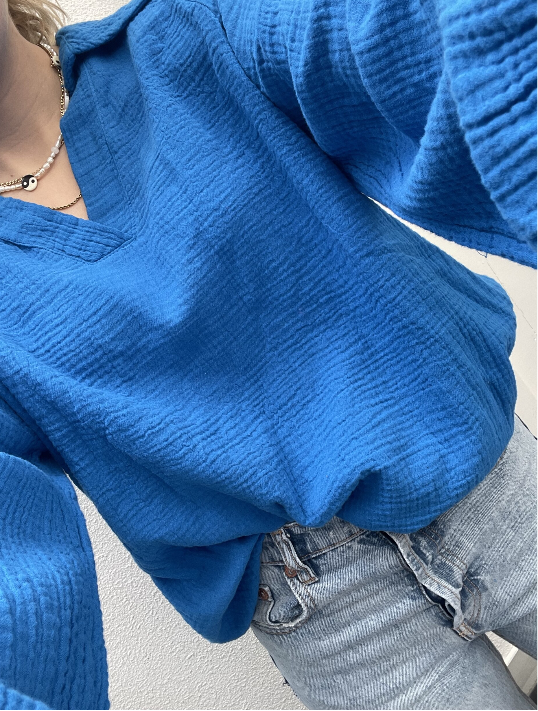 - Blouse is verkrijgbaar in 1 maat en heeft een oversized fit. De maat is vergelijkbaar met een M/L.